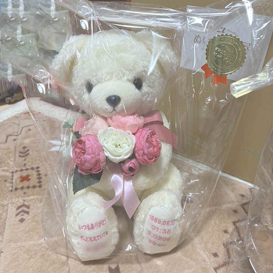 注文してから届くまでが早く、とても綺麗に包装されて届きました。結婚式当日、両親にサプライズで体重ベアを送りました!すごく可愛くて大きさもちょうど良く、両親ともにとても気に入ってくれました!