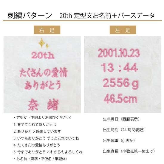 20thが入る特別メッセージを足裏に刺繍いたします。